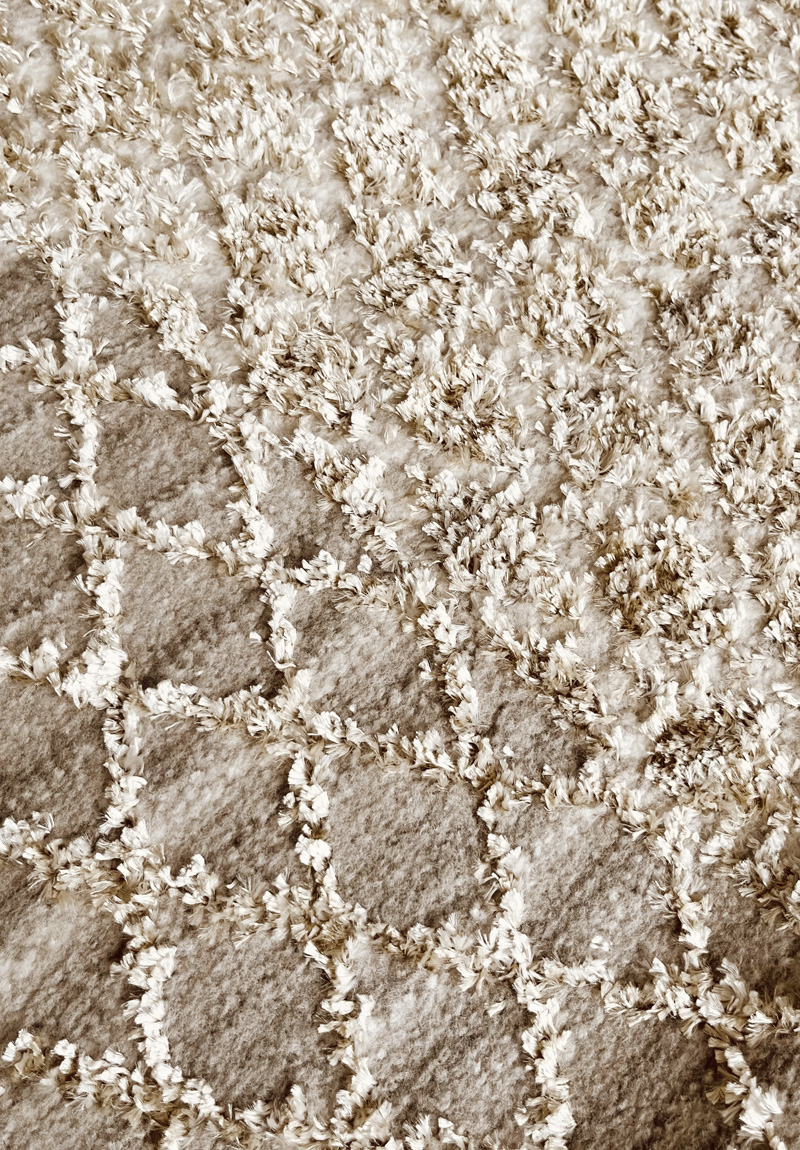 Tappeto Glossy: tappeto a pelo medio, con trame di filato cangianti a due livelli di spessore che creano un piacevole gioco di luci a seconda di come le si guarda.