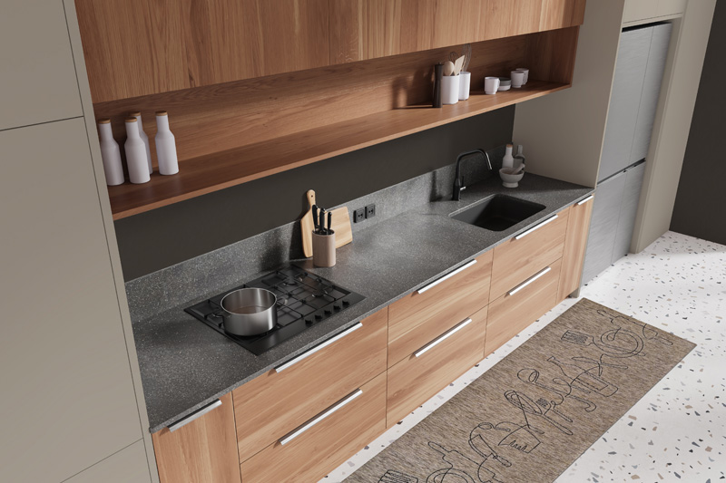 Tappeto/passatoia da cucina antiscivolo e lavabile, in morbido cotone ciniglia. Il tappeto Monolì,  presenta un decoro monolinea con elementi tipici della cucina. Disponibile in diversi colori moda, risulta essere un tappeto cucina adatto ad ogni cucina dalle più moderne, alle classiche.