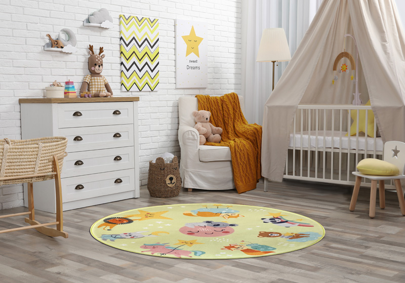 Tappeto per camerette bambini Candy, rotondo e colorato è realizzato in morbida imbottitura di spugna e disegno con stampa digitale in alta definizione. Tappeto gioco e arredo per abbellire la cameretta dei bambini.
